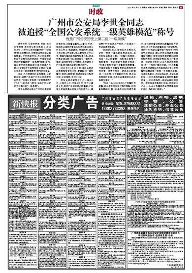 广州市公安局李世全同志被追授“全国公安系统一级英雄模范”称号