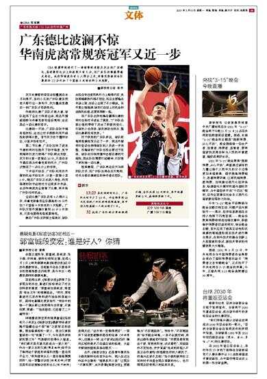 ●CBA·常规赛 广东东莞大益110:104时代中国广州 CBA联赛昨晚进行了一场南粤球迷极为关注的广东德比,虽然最终比分上的差距只有6分,但广东队的确赢得毫无悬念。此役华南虎共有6
