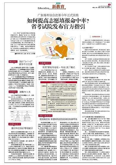 广东高考综合改革今年正式实施 2021年是广东省高考综合改革落地实施的元年。随着《广东省2021年普通高等学校招生考试和录取工作实施方案》《广东省2021年普通高等学校招生专业目录》《广东省2021年普通高等学校招生志愿填报指南》等文件的相继印发,广东省2021年夏季高考考试和志愿填报的新变化也一一清晰。到底有哪些新变化,今年高考生在填报志愿时又有哪些注意事项?我们一起来看看吧。 ■新快报记者 王娟 实习生 白仲夏 科目变化 实行“3+1+2” 数学不分文理 2021年高考由语文、数学、外语3门全国统一高考科目和3门广东省普通高中学业水平选择性考试科目组成,实行“3+1+2”考试模式。艺体类考生还需加考相应专业术科考试。其中,高考数学科目不分文理、不分物理历史。 3门广东省普通高中学业水平选择性考试科目,由考生根据所报考高校和招生专业的选择性考试科目要求及自身兴趣特长,在物理、历史2门科目中自主选择1门,在思想政治、地理、化学、生物学4门科目中自主选择2门组成(简称“四选二”)。广东省普通高中学业水平选择性考试科目由广东自主命题。 时间变化 调整为3天 2021年高考考试时间调整为3天,安排在6月7日—9日举行。 语文科目考试时长为150分钟,数学、外语科目考试时长均为120分钟;物理、历史、化学、地理、思想政治、生物学,每科考试时长75分钟;6月9日上午化学与地理两门科目之间、下午思想政治与生物学两门科目之间间隔75分钟。 成绩构成变化 部分科目实行等级赋分 高考文化总成绩卷面满分值为750分,由考生相关考试科目的成绩组成。如普通类(物理)考生总成绩:语文+数学+外语+物理+四选二;普通类(历史)考生总成绩:语文+数学+外语+历史+四选二。 艺术体育类文化课成绩:语文+数学+外语+物理(或历史)+四选二。 各科目卷面满分值,语、数、外每科目满分150分,其余6科每科目满分100分。物理、历史科目按考生卷面分计入高考文化总成绩,思想政治、地理、化学、生物学按考生等级赋分计入高考文化总成绩;体育、音乐等术科满分值各为300分。 外语选考英语语种:英语科目总成绩:笔试成绩×13÷12+英语听说考试成绩(四舍五入取整),英语听说考试成绩:英语听说考试卷面分÷3(四舍五入取整)。 志愿填报变化 采用“院校专业组+专业(类)”模式 2021年高校招生专业分为普通类(物理)、普通类(历史)、艺体类(音乐类、美术类、舞蹈类等)。普通类考生报考科类不分文理科类,而是分成选考物理和选考历史科目组;艺术类增加了书法类统考。 改革前,1所院校即为1个志愿,按照“1所院校+多个专业”的方式进行志愿填报;从2021年开始,高考志愿单位从“院校”变为“院校专业组”,具体变化见表格: 2021年高考志愿填报变化 志愿单位 1个院校拆分为若干院校专业组,1个院校专业组为1个志愿,按“院校专业组+专业(类)”的方式填报,1个院校专业组即为一个投档单位。每个院校专业组内设6个专业志愿和1个是否服从专业调剂选项。可填满所有志愿,也可只填报部分志愿。 志愿数量 普通类本专科各设置45个院校专业组平行志愿,艺体类考本科实行平行志愿的批次各设置20个院校专业组平行志愿。 填报要求 选考科目须符合拟填报院校专业组的选考科目要求。考生应对照高校招生专业(类)的选考科目要求,精准报考。普通类分物理和历史两类,艺体类不分物理和历史,选考物理和历史的考生一起排队,总分高者优先。 其他变化 军体院校从顺序志愿调整为平行志愿,且公安院校纳入军体院校志愿栏中填报。 录取分数线变化 取消高优线 新增特殊类型招录控制参考线 考试院特别提醒,2021年广东省本科高校不再设高分优先投档线,平行志愿投档中,所有考生、所有本科高校(专业)均实行一次性投档,即按考生投档分从高到低排序,依次检索考生所填院校专业组志愿进行投档。 只要考生所填报的院校专业组志愿中被检索到符合投档条件的,即向该院校专业组投档。如果考生档案投档到某院校专业组后,因故被退出,将不再补投到该批次平行志愿的其他院校专业组。 今年,将新增“特殊类型招生录取控制参考分数线”,该分数线按普通类(物理)、普通类(历史),参照往年文理科本一批或本二批院校招生计划比例分别划定。主要用于高校专项计划、高水平艺术团、高水平运动队、综合评价等特殊类型及其他有相应文化成绩要求的院校(专业)招生录取,符合要求且成绩达到控制线的考生,全部投档给院校。这些特殊类型招生单独设置特殊类型志愿,录取安排在本科提前批次。考生要注意,特殊类型志愿设置1个院校专业组志愿,高校专项、高水平艺术团、高水平运动队、综合评价4类志愿之间不得兼报。 记者从广东省教育考试院发布的《关于做好2021年基于高考基础上综合评价招生录取模式试点工作的通知》中发现,2021年在粤进行综合评价招生的高校从去年的11所变为10所,包括浙江大学、华南理工大学、南方科技大学、西交利物浦大学、北京师范大学—香港浸会大学联合国际学院、香港中文大学(深圳)、深圳北理莫斯科大学,中山大学没有出现在该通知中。 志愿填报指南 面对今年广东新高考的种种变化,考生该如何做好志愿填报工作?考试院给出了“五大退档雷区”、“五要看”和五个注意事项作为指引。 五大退档“雷区” 根据近年来的录
