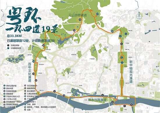 将新中轴线步行观光道、滨江碧道、传统中轴线路径,与云道首尾相接,形成“粤环” 新快报讯 记者陈慕媛 通讯员穗规资宣报道 3月15日,广州市规划和自然资源局公布《广州环新旧中轴线步行观光道规划》(征求意见稿)(下称“规划”),透露广州将打造全长33.3公里环新旧中轴线步行观光道,形成1日徒步最佳路径,助力展现花城特色,散发珠江风情,焕发老城市新活力。 规划发挥“云道”效应,结合经济文化学者和市民建议,借力现有公园绿地、城市空间和在建项目,将新中轴线步行观光道、滨江碧道、传统中轴线路径,与云道首尾相接,形成广州环新旧中轴线步行观光道“粤环”。 规划显示,“粤环”共打通7处断点,营造19处节点,串联沿线17处公园绿地,6处商圈,21处国家文保单位。并以云山珠水、新旧交融为主题,采用空中、地面、隧道、建筑多位一体的连通方式,结合广州经济、文化、自然生活场景,策划阅游城央的新中轴观光漫道、乐赏珠水的珠水丝路漫道、悦享经典的百年文化漫道和跃览云巅的云山游憩漫道四大主题漫道。 其中,新中轴观光漫道增加了夜跑设施与标识,夜跑漫道至体育中心健康步道提升;改造了六运步行街至花城广场地下出入口,利用地下空间连通断点,带动六运社区提升;在建的二沙岛景观人行桥打通江面断点,过江直达广州塔。 珠水丝路漫道中,在建的沿江东路提升现有绿地,打造综合型滨水公园。百年文化漫道在建的起义路增加建筑立面装饰,恢复传统骑楼界面,打造百年文化复兴路径;在建的人民公园整合活动空间,强化展示功能。云山游憩漫道广州花园花桥在建,最终与已建云道形成闭环。 目前,“粤环”沿线已建成1处云道项目,可借力的在建项目11处。计划新增项目7处,燕岭森林步道、体育中心夜跑漫道、纪念堂北门过街优化、濂泉路-广园东路-禺东西路人行道提升等4处节点拟近期实施建设。燕岭天桥、浮桥探桥工程、六运步行街地下出入口共3处节点拟统筹协调,远期实施。
