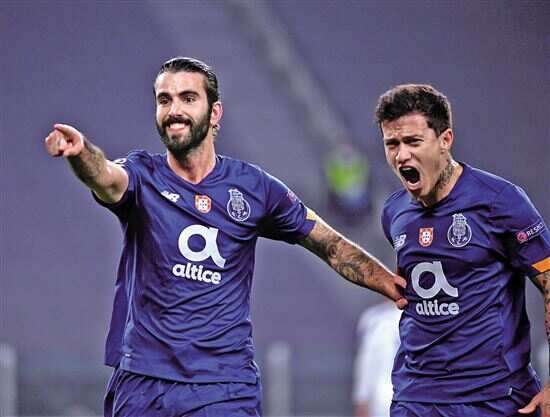 ■波尔图队球员奥利维拉(左)庆祝进球。 新华社发 |