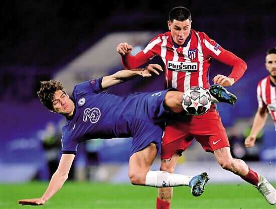 ■切尔西队球员阿隆索(左)与马竞球员希门尼斯拼抢。 新华社发 |