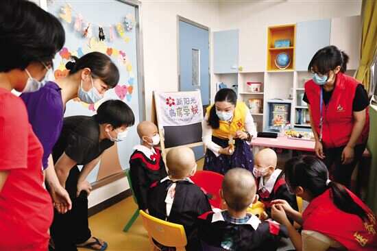 在广州南方医科大学珠江医院儿科中心5楼小儿血液科,有不少白血病的孩子。他们因病不得不暂时休学,住院接受治疗。但住院只能躺在病房、休学意味着与课堂无缘?昨日,南方医科大学珠江医院新阳光病房学校正式揭牌,首个教室地点设在小儿血液科。在该学校,将有专职老师定期免费为有需要的孩子提供各类课程,为家长提供讲座等,帮助患儿保持学习能力和社会适应能力。 据了解,病房学校由南方医科大学珠江医院儿科与北京新阳光慈善基金会合作搭建。珠江医院儿科中心小儿血液科主任杨丽华表示,此次与基金会合作开设病房学校,也是希望让孩子们在病房里也能享受快乐的童年,这对于他们病情的恢复也能起到一定的作用。 揭牌仪式结束后,病房学校举行了一场特别的开笔礼。“正衣冠”“朱砂启智”“寄语祝福”……系列环节的举行标志着病房学校正式开学。 新快报记者 孙毅 通讯员 伍晓丹 韩羽柔 曹云娜 摄影报道