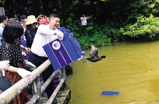 ■有关部门工作人员和广州市民一起将野生鸟类放归帽峰山。 |