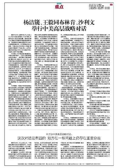 中方谈中美高层战略对话: 据新华社电 3月18日至19日,中美高层战略对话在安克雷奇举行。对话结束后,中共中央政治局委员、中央外事工作委员会办公室主任杨洁篪、国务委员兼外长王毅接受了媒体采