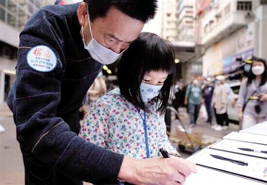■3月12日,在香港湾仔,周先生带着6岁的女儿来到签名桌前和女儿一起写下名字。 |