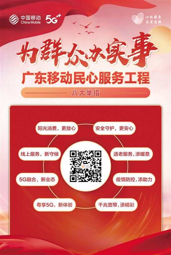 为群众办实事,大力实施“民心服务工程” 民生是人民幸福之基、社会和谐之本。在习近平新时代中国特色社会主义思想指引下,中国移动公司始终贯彻“以人民为中心”发展理念,推进信息技术与经济社会民生深度融合,加快建设成为网络强国、数字中国、智慧社会主力军,推动信息服务融入百业、服务大众。 2021年是“十四五”规划开局之年,广东移动以“增进民生福祉,不断实现人民对美好生活的向往”为目标,落实集团公司“心级服务,为爱连接”工作要求,大力实施“民心服务工程”,面向社会推出“八大服务举措”,围绕透明消费、信息安全、数智服务、民生服务四大重心,持续为人民办实事,为保障和改善民生贡献力量。 阳光消费,更放心 广东移动持续落实三项增值业务透明消费举措,保障客户消费知情权和选择权;每月对1.3亿客户发送新版账单或5G消息账单,让客户话费算得清、优惠对得上、收费看得懂。 安全守护,更安心 广东移动严格落实国家相关法律法规要求,保护客户个人信息,新入网客户实名登记率100%,同时大力整治不良信息(如垃圾短信、骚扰诈骗电话、互联网淫秽色情信息等),创新防护举措(“谢绝来电”、“呼死你”、“短信炸弹”等应急防护举措),营造清朗网络空间。 线上服务,新守候 广东移动打造全天候线上服务矩阵,在广东移动智慧生活APP、微信公众号等线上渠道,提供五大类200多项服务,7×24小时为客户在线守候。 5G融合,新业态 广东移动推动5G深度融入社会管理、行业应用和客户生活的各个环节,打造5G消息、宽带电视、5G专网等基础服务和数字生活权益超市、数字产业等九大关键平台,提升广连接、低时延、高可靠等定制化网络体验,保障公众网络安全稳定、行业支撑敏捷高效,促进千行百业提质提效。 粤享5G,新体验 广东移动聚焦广东本地特色,搭建5G创新应用聚合平台,开发手机客户端“粤享5G”,同时与电视大屏进行跨屏融合,聚合5G生态链上各方创新应用,提供超20万小时的优质内容,为客户带来沉浸式的5G应用体验。 适老服务,添暖意 在10086热线,为全省65岁及以上老人提供直入人工服务;在营业厅提供优先排队及专窗服务、业务办理爱心座椅,提供现金、第三方支付等多种支付方式,提供老年人智能手机使用手册,并为老年人配备急救药箱;在“中国移动10086”微信小程序及“广东移动智慧生活”APP,上线老年人关怀版本,提供大字体、界面操作更简易方便的服务。 疫情防控,添助力 广东移动针对疫情防控不同场景提供多样化支撑: 针对公共出行场景,推广部署“科技战疫”利器——基于5G的健康码智能通行系统,高效地完成“人、证、码”三合一验证,为严守防疫关口提供有力支撑;针对在线医疗场景,推广部署互联网医院,为患者提供一站式互联网诊疗服务,降低慢病、非紧急就诊人群疫情期间院内交叉感染风险,为疫情防控提供有力支撑;针对个人防疫场景,在广东移动智慧生活APP防疫专区,提供特色防疫信息化服务。 千兆宽带,添精彩 广东移动全面推出宽带24小时服务,即在客户成功办理装移机后,2小时内有专人联系预约上门时间,自约定时间起,24小时内完成安装和网络测通;针对使用故障,同样在2小时内预约上门维修时间,并自约定时间起,24小时内完成修障。全省近万名智慧家庭工程师为客户的网络保驾护航。(备注: 24小时装移机服务,针对宽带资源覆盖且资源满足及物业允许的小区。24小时修障服务需排除以下情况: 宽带故障受市政施工、三线整改、物业阻挠等不可抗力影响。) “民心工程”惠人民,为民服务暖人心。站在“两个一百年”奋斗目标的历史交汇点上,广东移动将勇于承担起时代赋予的责任与使命,始终以人民和社会经济发展的需要为出发点,坚持创新为民、发展为民、建设为民、服务为民,全力推进信息发展红利全民共享、信息发展成果普惠民生!(郑志辉)