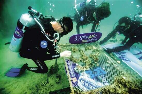 3月21日,志愿者在深圳大鹏金沙湾海域海底扶植珊瑚。 当天是世界森林日,来自深圳的志愿者在深圳大鹏金沙湾海域举行“珊瑚扶植”活动。来自各行各业的10名志愿者下海清理垃圾,收集珊瑚残肢并固定在特定区域的苗圃上。未来,这些珊瑚稳定成长并恢复生机后,将会被放回海底的礁石上,此次活动旨在呼吁更多人关注“海底森林”——珊瑚礁,加强公众对海洋生态的保护意识。 新华社发