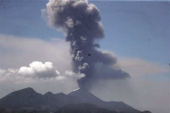 图像 3月23日,直升机从危地马拉首都危地马拉城上空飞过,远处是正在喷发的帕卡亚火山。 危地马拉民航部门23日因帕卡亚火山喷发而关闭首都危地马拉城的拉奥罗拉国际机场。 帕卡亚火山曾在2010年猛烈喷发,导致一名记者和两名居民丧生。 新华社发