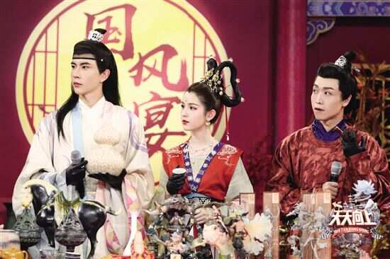 “唐宫小姐姐”惊艳全场 新快报讯 记者徐绍娜报道 湖南卫视《天天向上》上周日晚上演了一场特殊的“国风夜宴”。节目中,汪涵化身潭州府汪老爷,设宴为游历归来的三位公子钱枫、大张伟、王一博接风洗尘,满载而归的他们带来令人眼前一亮的国风大礼。他们与杨迪、于朦胧、张海宇、哈妮克孜以及五湖四海的潭州府旧友们相聚,开启一场新国风文化盛宴。 舞一曲《唐宫夜宴》,尽显大唐盛世风韵。身着红绿襦裙、体态丰腴的少女们踏着小碎步,怀抱乐器“跨越千年”到了湖南,在各地标打卡留念。现场,唐宫小姐姐“神还原”唐朝人的表情特点和走路姿态,并邀请于朦胧、哈妮克孜等人一同进行表情包5连拍,画风十分有趣。作为《唐宫夜宴》节目中的名场面,汪涵现场让钱枫和王一博两人还原唐宫小姐姐调皮撞飞同伴的画面。杨迪和张海宇还现场脑补配音舞蹈中乐官少女们私语状态中的内容,脑洞大开的对话笑点密集。