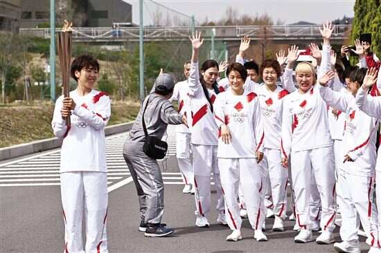 ■3月25日,日本前女足队员岩清水梓(左一)在火炬传递中。新华社发 |