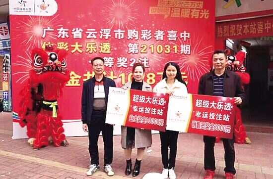 新快报讯 记者陆妍思 通讯员云浮体彩报道 大乐透第21031期开奖中,全国共中出27注一等奖,其中2注花落云浮市城区育华路4421021028体彩实体店。该店的一名购彩者凭借20元2倍投5注单式票喜中2注一等奖,总揽奖金1078万元,为云浮市贡献税收215万多元。此次大奖是2017年云浮市2次中出千万元大奖后,再次中出此级别大奖。3月23日,云浮市文化广电旅游体育局和云浮体彩中心有关领导为本次售出大乐透千万元大奖的4421021028体彩实体店颁奖贺喜。随着锣鼓响起,醒狮队翩翩起舞,现场表演吸引了众多周边街坊观看,纷纷为本次中出的幸运大奖拍手称赞。 据了解,4421021028体彩实体店是云浮市的优秀站点,平日就颇受附近街坊的欢迎。颁奖现场,业主激动地表示:“知道店里售出了千万大奖的彩票,非常激动,我真替中奖的幸运儿高兴!中国体育彩票是国家公益彩票,我经营体彩店十多年,坚持与公益同行十多年,感到十分骄傲。接下来的日子,我会继续用心经营,做好服务,筹集更多的公益金造福社会,同时倡导购彩者快乐购彩、理性购彩,希望能再次为购彩者带来好运、带来大奖。” 据统计,“十三五”期间,云浮市体育彩票销售14.15亿元,比“十二五”期间增长139%,筹集市级体育彩票公益金9773万元,增长143%,代扣代缴偶然所得税2000多万元。一张体育彩票的能量或许微小,但千千万万张体育彩票汇聚起来,便是能量浩荡的公益场,每一位购彩者,在体验游戏乐趣的同时,也助力了公益、奉献了爱心。