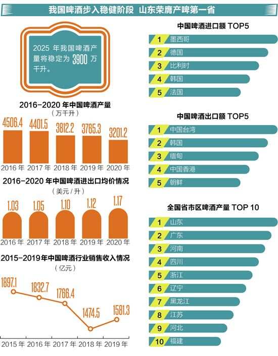 内资厂商发力,超5000家精酿品牌杀入战场 啤酒已经成为国内消费者的主流酒水饮料消费品种,广受大众青睐。随着消费升级,我国居民对于啤酒的消费逐渐向高端化发展,进而促使精酿市场需求持续攀升。 尽管有着较高的增速,但精酿啤酒仍是属于一小部分人的“狂欢”。精酿啤酒市场占有率约为1%-3%,精酿啤酒的前行之路,仍面临着老牌啤酒挤压和国际品牌抢夺话语权的“内忧外患”。在市场竞争方面,我国精酿啤酒品牌纷杂,但在制度的规范化要求下,未来精酿啤酒行业逐渐形成龙头竞争模式。 从高速发展步入稳健阶段,短期销量承压 纵观我国的啤酒行业发展历程, 发展势头由高爆发转为稳健,行业结构调整发展明显。据国家统计局数据,2005年起,啤酒行业进入快速增长阶段,2013年行业规模达到顶峰,产销量突破5000 万千升。中国酒业“十四五”发展指导意见(征求意见稿)规划提到,到2025年我国啤酒产量将稳定为3900万千升。 由于适龄消费群体人数减少和产品同质化,行业竞争加剧,自2014年以来,啤酒总产量增速逐渐放缓,销量相对稳定。从近三年数据来看,2018年、2019年、2020年三年的啤酒总产量同比下降分别为13.4%、1.23%、7.04%。疫情对啤酒行业的冲击尤为明显,2020年我国啤酒行业销售收入为1468.94亿元,同比下降6%以上。 据中国海关总署数据显示,2019年全年中国啤酒出口量达到了41759万升,累计增长8.3%。截止到2020年12月,中国啤酒出口量为3581万升,同比下降10%。累计方面,2020年全年中国啤酒出口量累计达到38674万升,累计下降7.4%。 截至目前,中国啤酒行业从多年的群雄混战过渡到华润雪花、青岛啤酒、百威英博、燕京啤酒、嘉士伯五强争霸的格局。具体来看,华润雪花早年凭借低价大单品走量,10年前就通过年销量千万吨进入世界啤酒头部阵营,但盈利能力一直是软肋;青岛啤酒在规模上被压制,但中高端更突出,盈利能力较强;百威作为夜场啤酒之王,一度在高端及超高端市场处于垄断地位。 啤酒行业短期销量承压,但长期来看结构升级仍是主要抓手。华西证券分析认为,2018 年开始,行业规模以上企业亏损面收窄至 25%以下,结合人口结构和行业现状,预计未来5年啤酒行业总产量将基本稳定,以人均消费量计,预计未来5年产量年化提升0.4%-2.5%。另外,2021年是体育大年,如奥运会和欧洲杯如期举办,则聚饮性场景有望增加,行业有望实现量价齐升。 内资啤酒厂商发力,行业高端化持续推进 在消费升级的大背景下,啤酒厂商纷纷进行高端化改革以实现进一步发展。根据欧睿数据,近年来我国中高端啤酒销量占比明显提升,但相较于海外成熟市场仍有较大上升空间,2019 年中国啤酒经济型、中端、高端销量占比为68%、21%、11%。 从具体啤酒厂商来看,均在发力高端市场。外资啤酒厂商在海外发展多年,拥有相对成熟和丰富的高端产品种类,高端市场占优。国内厂商如青岛、燕京和珠江坚持自主研发高端产品;华润和重啤在自研产品的同时,也分别引入喜力和嘉士伯的高端品牌以完善自身产品矩阵。 青岛啤酒2020年实现营业总收入277.6亿元,其中重要一部分原因便是品牌高端化。据了解,早在2010年,青岛啤酒率先推出“奥古特”“逸品纯生”两款高端产品后,后续不断对高端产品进行迭代更新,同时向听装、精酿等高附加值产品转型升级,转型效果显著。截至2020年上半年,青岛啤酒高端产品实现销量97.1万千升,占公司总销量的22.04%,占“青岛啤酒”品牌销量的46.44%。 此外,珠江啤酒高端产品持续发力,2020年实现业绩逆势增长,珠江啤酒表示公司通过聚焦产品创新,推动高档结构产品销量占比同比提升、吨酒销售收入同比提升,使公司营业总收入在销量下降情况下增长0.13%。 中信证券分析指出,中国啤酒高端化拐点已至,这既是啤酒行业发展的必然阶段,也是反复博弈后啤酒龙头公司的必然选择。啤酒市场升级空间广阔,预计未来“得高端化者得天下”。如何在高端化中胜出?中信证券指出:产品为基,完善产品矩阵,高端树品牌、中端求放量、主流做减法;渠道为王,区域因地制宜,渠道改革赋能。 ■策划:新快报记者 罗 韵 ■统筹:新快报记者 梁 彧 ■采写:新快报记者 张 磊 ■制图:廖木兴
