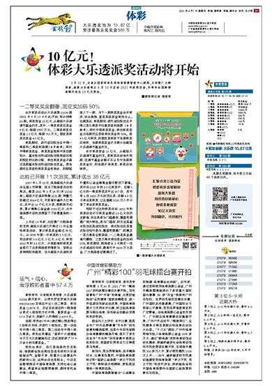 3月31日,记者从国家体育总局体育彩票管理中心获悉,为回馈广大购彩者,超级大乐透将从4月10日启动2021年派奖活动,共将向全国购彩者额外送出10亿元奖金。 ■新快报记者 陆妍思 一