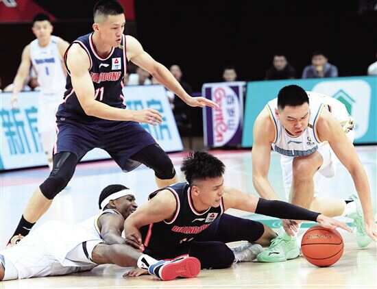 ■广东队赵睿(右二)和北京队球员吉布森(左下)拼抢。 新华社发 |