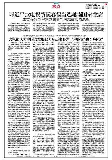 李克强致电祝贺范明政当选越南政府总理 据新华社电 4月5日,国家主席习近平致电阮春福,祝贺他当选越南国家主席。 习近平在贺电中指出,中越是山水相连的社会主义邻邦。去年以来,双方守望相