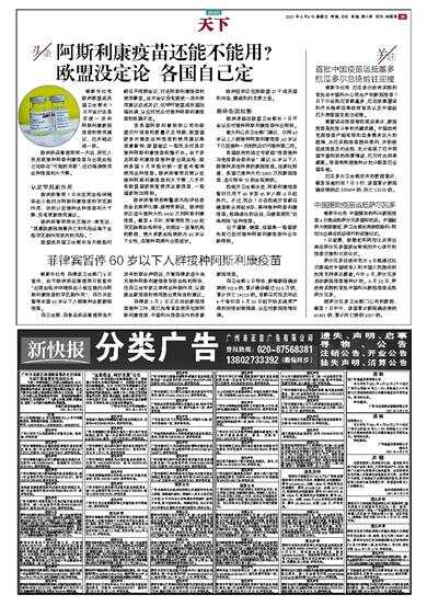 头条 据新华社电 欧洲联盟成员国卫生部长7日开会讨论是否统一发布阿斯利康新冠疫苗的使用建议,但未能达成一致。 欧洲药品管理局同一天说,研究人员发现接种阿斯利康疫苗与出现血栓之间存在“