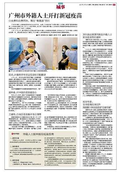 分免费和自费两种, 需在“粤健通”预约 广州市外籍人士新冠疫苗首针在白云区开打。此前,广东省启动了在粤外籍人士适龄人群国产新冠病毒疫苗(上市阶段)接种工作,4月12日起可预约,并公布广东省