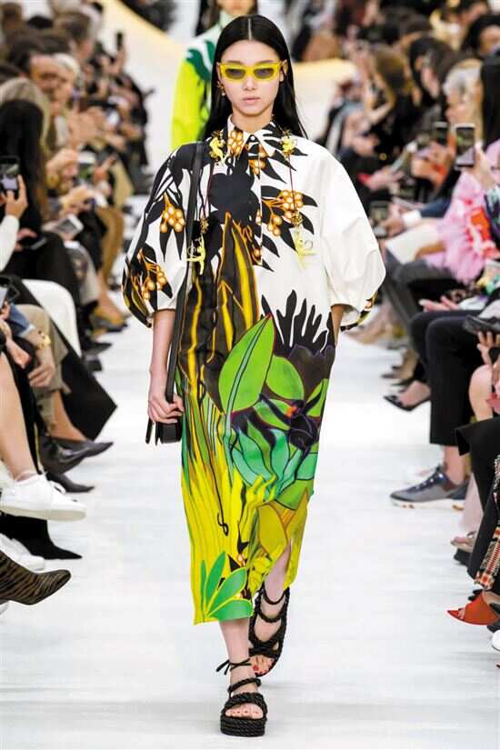 印花向来是甜美代表,今年春夏流行的印花更偏自然气息,回归本真,以花草所寓意的生机勃勃表达积极的生活态度,提亮整体造型中的春色。 ■新快报记者 梁彧/文(资料图片) Focus A 艺术气息浓郁的绘画植物 用线条与版画形式表达的植物形态,呈现出休闲度假和浪漫优雅。 这一类印花通常色彩大方柔和,有浓郁的文艺气息。 亦可以选择通过彩绘、柔焦、模糊等处理的花卉图案,达到复古艺术效果,即使全身印满也不会觉得艳俗,是今季春夏十分值得一试的植物印花类型。 Focus B 热情奔放的热带植物 热带植物一直都是非常受欢迎且经典的图案,今年春夏则将热带植物图案进行抽象的平面化处理,加大色块化效果,使图案更抽象,以简约时尚让图案表现更年轻,更具现代感。