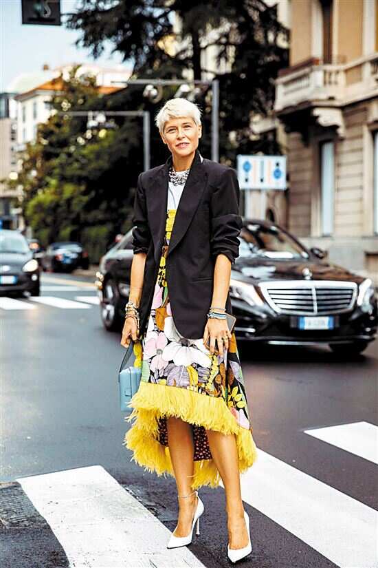 担心色彩过于鲜艳难驾驭,可以试一下单色化处理的热带植物印花,虽然穿搭难度降低但浓郁复杂的图案依然冲击力十足,造型同样能出彩。 |