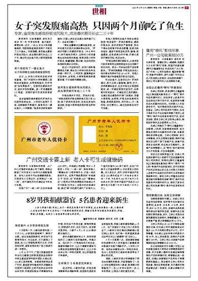 专家:食用鱼生感染肝吸虫风险大,成虫潜伏期可长达二三十年 新快报讯 记者高镛舒 通讯员王俊洁 朱一艺 许咏怡报道 鱼片虽好,莫要生食!近日,一名21岁女子突发腹痛高热,到医院检查竟是因两