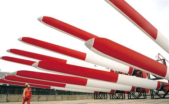 ■4月16日,风力发电机叶片在江苏连云港港码头等待装船外运。新华社发 |