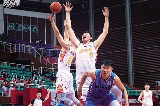 ■深圳马可波罗队球员白昊天(上左)、赵义明(上右)与北京首钢队球员范子铭(下)在比赛中拼抢篮板球。新华社发 |