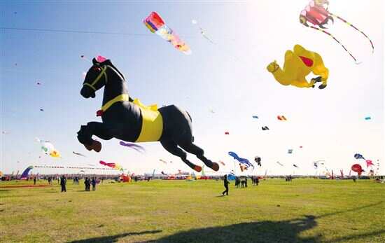 当日,第38届潍坊国际风筝会放飞比赛在山东潍坊滨海国际风筝放飞场举行,来自全国各地的多支风筝放飞队参加比赛。新华社发