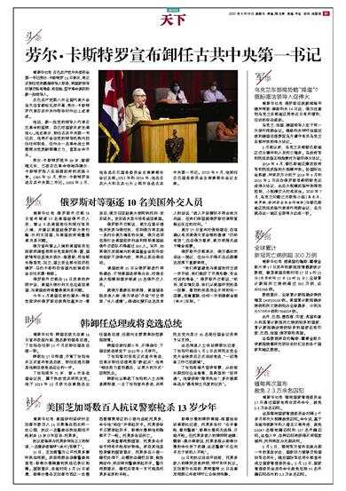 据新华社电 古巴共产党中央委员会第一书记劳尔·卡斯特罗16日表示,将正式卸任党的最高领导人职务,将国家领导权移交给有准备、有经验、坚守革命原则的新一批领导人。 古巴共产党第八次全国代表大会