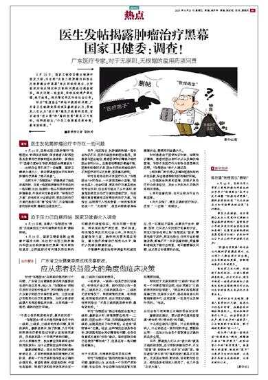 广东医疗专家:对于无原则、无根据的滥用药须问责 4月19日,国家卫健委官微@健康中国发文称:关注到“北医三院肿瘤内科医生反映肿瘤治疗黑幕”有关网络信息后,立即组织对有关情况和反映的问题进行
