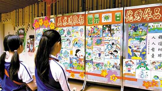 ■同学们观看世界地球日主题绘画优秀作品展。 |