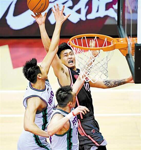 ■4月22日,广东东莞大益队球员赵睿(上)在比赛中上篮。新华社发 |
