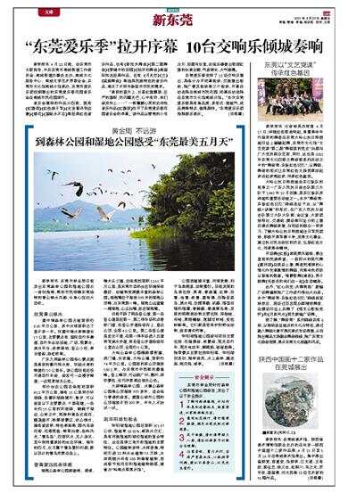 黄金周 不远游 新快报讯 东莞市林业局日前发出东莞森林公园和湿地公园五一游玩指南,帮助市民领略东莞独特的青山绿水风韵,令身心回归大自然。 欣赏青山绿水 黄牛埔森林公园占地面积约
