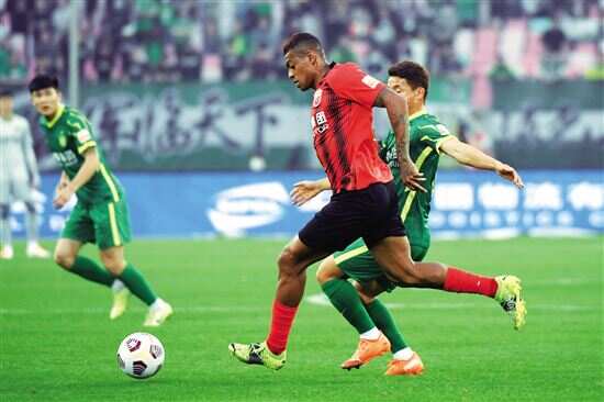 ■海港队球员里卡多·洛佩斯(前)摆脱国安球员池忠国防守。 新华社发 |