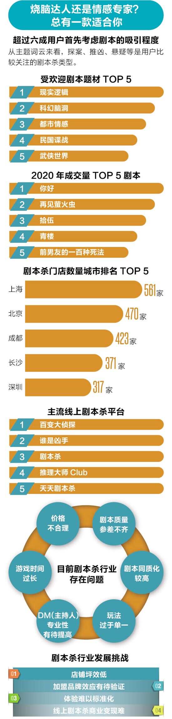 玩家爱烧脑爱推理,现实逻辑剧本最受欢迎 数据显示,在选择线下剧本杀商家时,超过六成用户首先考虑剧本的吸引程度,其次是店内环境等其他因素。从剧本题材来看,现实逻辑类更受网民青睐,占比为51.7%。而科幻脑洞类、都市情感类、民国谍战类剧本也是大众较为喜欢的题材。从主题词云来看,探案、推凶、悬疑等是用户比较关注的剧本杀类型。 优质原创的剧本是吸引玩家的核心,因而一些剧本杀将游戏和影视、小说IP一起联动开发,推动优质剧本创作,同时通过打造知名剧本杀IP提高门店影响力。例如剧本《古董局中局》,这部作品将小说、影视和游戏串联在一起,以《唐人街探案3》中的日本“中华街”场景作为线下体验馆的新主题;网易云阅读与剧本杀APP合作,推出与咬狗的《梦境缉凶》同名的剧本。 艾媒咨询分析师认为,线下剧本杀是一种体验式消费,更注重玩家在游戏中的代入感,因而剧情风格、 情节的走向等都是用户比较在意的因素,这就需要线下剧本杀商家了解玩家的需求并推出符合大众口味的剧本,同时这会倒逼上游剧本供应端,在剧本上进行创新,避免同质化。 数据显示,截至2021年3月,上海剧本杀门店数量超过500家,明显高于北京、深圳和广州。此外,典型的网红城市如成都,剧本杀门店数量超过400家。搜索可以发现,北京、成都、长沙等网红城市的剧本杀商家正在做“剧场+剧本杀”、“文旅+剧本杀”等新尝试,与剧本杀相关的新业态正蓄势待发。悬疑IP与剧本杀的联合开发模式也为游戏、网络文学的发展提供了新的发展思路。 业内人士分析认为,经济实力排名靠前的城市,城市居民的生活和工作节奏比较快,压力指数也比较高,对于剧本杀等沉浸式重体验的游戏需求会更高。而成都、长沙等地将剧本杀与文旅结合发展,也带动了当地剧本杀门店数量的增长。 剧本同质化玩法单一,行业面临新一轮洗牌 从目前的调研来看,中国55.4%网民认为剧本杀行业存在的问题在于剧本质量参差不齐。而剧本同质化较高、剧本杀玩法过于单一、Dm(主持人)专业性有待提高、游戏时间过长等也是用户普遍反映的问题之一。 艾媒咨询分析师认为,剧本杀的游戏时长除了与剧本长度、剧情复杂程度有关之外,主持人对于游戏节奏的把控也是影响时长的重要因素。目前剧本杀行业中还没有一套完整的主持人培训规范,这也导致业内主持人水平参差不齐。建立完善的主持人培训体系有助于大幅提升玩家的游戏体验,这也将是剧本杀行业发展的关键因素。 此外,剧本杀存在消费分化的趋势。当前市场上,剧本杀人均单价较高的可以达到500元以上,低一点的在40-60元之间,存在明显消费分化。因此,剧本杀上游的创作者及发行公司以及剧本杀商家,都需要投入更多的资源和创意来造就出更丰富多样的产品和服务,进而满足不同的消费群体的需求。 随着剧本杀热度的回归理性,用户量可能有一定的回落,而深度用户的频率或会增加。业内人士分析认为,剧本杀行业发展正在面临新一轮洗牌,中国剧本杀行业正逐步从小众消费向更大的市场发展,留下来的门店商家,需要在剧本内容打磨、门店设计等关键要素上持续发力,让玩家获得更好的游戏体验,以提升市场竞争力。