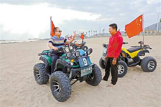 ■“80后”黄泽伟(右一)看到家乡发展起来了,辞工回到洲渚村,买了十几辆沙滩摩托,做起游客的生意。 |