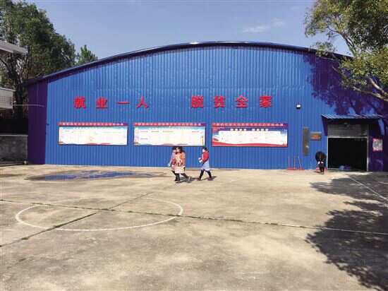 ■乐昌市坪石镇仁里村扶贫车间外,有“就业 一人 脱贫全家”的标语。 |