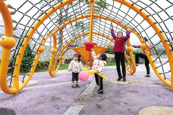 ■村民在河畔小广场里的儿童乐园游乐。 |