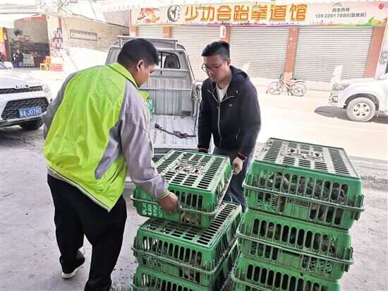 ■梁斯稳与队员一起为村民发鸡鸭苗。 |