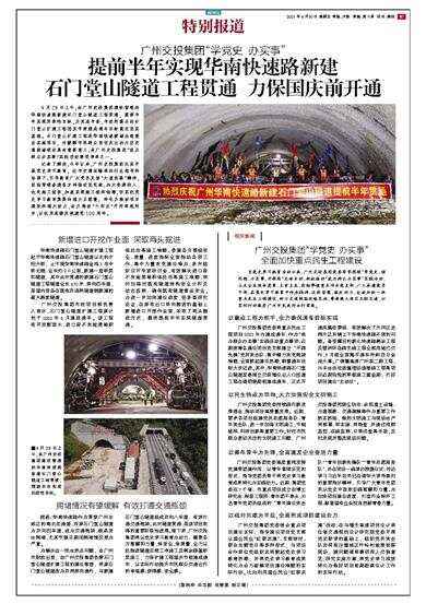 广州交投集团“学党史 办实事” 4月29日上午,由广州交投集团建设管理的华南快速路新建石门堂山隧道工程贯通,提前半年实现阶段性目标,为完成市委、市政府提出的石门堂山扩建工程国庆节前建成通车