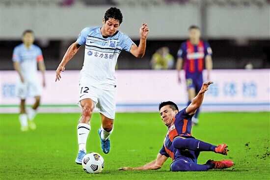 ■本场对阵深足,广州城队可能不会主动出击,而是把决胜时间留到最后阶段。图为5月3日,广州城队球员吉列尔梅(左)与青岛队球员王伟在比赛中拼抢。新华社发 |