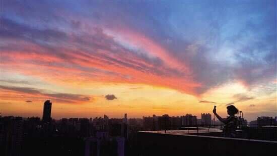 ■昨日傍晚,广州红霞满天,市民拿着手机记录这一美丽瞬间。新快报记者 夏世焱/摄