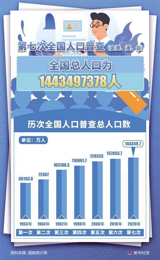 人口有哪些变化?“全面两孩”政策给力吗?老龄化进程加快了吗…… 据新华社电 第七次全国人口普查主要数据结果11日发布。10年来,我国人口有哪些变化?“全面两孩”政策给力吗?老龄化进程加快了吗?我们一起从数据中找答案。 【数据1】 14.1亿人: 增速放缓,平稳增长 普查结果显示,全国人口共141178万人,与2010年第六次全国人口普查数据相比,增加7206万人,增长5.38%,年平均增长率为0.53%,比2000年到2010年的年平均增长率下降0.04个百分点。 全国人口中,汉族人口为1286311334人,占91.11%;各少数民族人口为125467390人,占8.89%。与2010年第六次全国人口普查相比,汉族人口增加60378693人,增长4.93%;各少数民族人口增加11675179人,增长10.26%。 增速放缓,平稳增长,是我国总人口状况的主要特点。第七次全国人口普查领导小组副组长、国家统计局局长宁吉喆说,我国人口保持了一定水平的惯性增长。我国人口基数大,目前育龄妇女还有3亿多人,每年能够保持1000多万的出生人口规模。 宁吉喆说,从近年来我国人口发展变化的趋势看,今后的人口增速将继续放缓。同时,人口增长还受人口年龄结构、人们的生育观念、生育政策、生育成本、公共卫生和健康水平等经济社会因素的影响,我国人口今后会达到峰值,但具体时间现在看还有不确定性,预计在未来一段时间内我国人口总量会保持在14亿人以上。 【数据2】 2020年总和生育率1.3: 低生育将成为我国的现实问题 “随着‘单独二孩’‘全面两孩’政策实施,出生人口数量快速回升。”宁吉喆说,生育政策调整成效积极。2016年和2017年我国出生人口大幅增加,分别超过1800万人和1700万人,比“全面两孩”政策实施前分别多出200多万人和100多万人。从生育孩次看,2014至2017年,出生人口中“二孩”占比明显上升,由2013年的30%左右上升到2017年的50%左右;此后虽有所下降,但仍然高于40%。由于生育政策调整的因素,全国多出生“二孩”数量达1000多万人。 宁吉喆说,2018年以来出生人口的数量有所回落。初步汇总的结果显示,2020年我国出生人口为1200万人,这个规模仍然不小。 宁吉喆说,数据表明,2020年我国育龄妇女总和生育率为1.3,已经处于较低水平。这主要受到育龄妇女数量持续减少、“二孩”效应逐步减弱的影响。从2020年来看,新冠肺炎疫情增加了生活的不确定性和对住院分娩的担忧,进一步降低了居民生育的意愿。 宁吉喆认为,生育水平的高低既受政策因素的影响,也受经济、社会、文化等因素的影响,后者的影响力在逐步增强。随着经济社会的持续发展,尤其是工业化、现代化带来的人口生育观念转变等方面的影响,低生育已经成为大多数发达国家普遍面临的问题,也将成为我国面临的现实问题。 【数据3】 平均每户2.62人: 家庭越来越小 普查结果显示,全国共有家庭户49416万户,家庭户人口为129281万人。平均每个家庭户人口为2.62人,比2010年减少0.48人。 “家庭户规模继续缩小,主要是受我国人口流动日趋频繁和住房条件改善以及年轻人婚后独立居住等因素的影响。”宁吉喆说。 中国人口与发展研究中心主任贺丹表示,家庭户规模对于经济社会发展资源配置影响很大。我国从传统的几代人大家庭逐步发展为更多小家庭,无论对养老还是育儿来说,代际家庭支持功能将弱化,也意味着需要更多来自家庭外部的社会政策支持。 【数据4】 10年减少1101万人: 东北人去哪了 数据显示,2020年,东北三省总人口9851万人,接近1亿人,规模依然较大,但比10年前减少1101万人。 宁吉喆表示,东北地区人口减少,受自然环境、地理环境、人口生育水平和经济社会发展等多方面因素影响。东北地区经济正处于结构调整攻坚期,沿海经济发达地区发展机会和就业前景,对其他地区包括东北地区人口有较大吸引力。 “当前东北经济发展的韧性仍在,潜力很大。”宁吉喆说,新一轮振兴计划必将带来东北地区人口发展新变化。 【数据5】 男女性别比105.1: 逐渐趋向正常 普查结果显示,我国男性人口为72334万人,占51.24%;女性人口为68844万人,占48.76%。总人口性别比为105.1,与第六次全国人口普查时的105.2相比基本持平,略有降低。 “我国人口的性别结构持续改善。”宁吉喆说,“从新生儿的情况看,出生人口性别比为111.3,较2010年下降6.8,逐渐趋向正常水平。” 贺丹表示,性别均衡发展是人口结构均衡发展的重要方面,也反映出我国在促进性别平等发展方面的进步。 【数据6】 老年人超2.64亿: 挑战也是机遇 普查结果显示,我国0至14岁人口为25338万人,占17.95%;15至59岁人口为89438万人,占63.35%;60岁及以上人口为26402万人,占18.70%。其中,65岁及以上人口为19064万人,占13.50%。 与2010年相比,0至14岁、60岁及以上人口的比重分别上升1.35和5.44个百分点。 “人口老龄化程度进一步加深,未来一段时期将持续面临人口长期均衡发展的压力。”宁吉喆表示,人口老龄化将减少劳动力的供给数量、增加家庭养老负担和基本公共服务供给的压力,同时也促进了“银发经济”发展,扩大了老年产品和服务消费,还有利于推动技术进步。 【数据7】 有大学文化程度的超2.18亿: 人口素质更高 从人口质量上看,我国人口受教育水平明显提高,人口素质不断提高。普查结果显示,具有大学文化程度的人口为21836万人。与2010年相比,每10万人中具有大学文化程度的由8930人上升为15467人。 15岁及以上人口平均受教育年限由9.