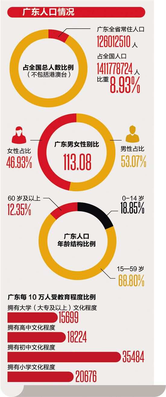 ●专家认为处于经济社会“高段位”发展的广东,对人口特别是高质量人口仍具吸引力 ●广东已处于老龄化社会状态,未来5-10年可能会向更深层次老龄化社会迈进 5月11日,国家统计局发布第七次全国人口普查公报。截至2020年11月1日零时,全国总人口为1443497378人,其中:普查登记的大陆31个省、自治区、直辖市和现役军人的人口(不包括居住在31个省、自治区、直辖市的港澳台居民和外籍人员)共1411778724人(即全国人口)。 新快报记者梳理发现,广东全省常住人口为126012510人,已连续14年居全国首位。此外,广东在多个指标上也位列榜首:15-59岁人口占比最多,男女性别比最高,港澳台居民和外籍人员居住者最多。 ■采写:新快报记者 王彤 王娟 通讯员 李佳莉 人口规模和十年增量都位居全国首位 【数据】广东全省常住人口为126012510人,占全国人口的比重约为8.93%。自2007年以来,广东连续14年常住人口规模居全国首位。与2010年相比,十年共增加2170万多人,增长20.81%,人口增量位居全国首位。 【分析】 广州市社会科学院城市管理研究所副研究员宁超乔分析指出,在经济和社会发展中,人口具有重要的作用。一方面,人是社会经济活动的主体,创造了与社会、经济、文化有关的物质和精神文明。另一方面,人是国家和城市发展的重要战略资源,改革开放四十多年来年轻劳动力充足所带来的人口红利一直是我国城市发展的核心动力之一。“可以说,作为城市发展最重要和首要的问题,人口决定了城市未来的兴衰成败的关键。未来城市的竞争,将是人口的竞争”。 宁超乔分析,广东人口“十四连冠”说明广东地区城市在全国经济社会发展中处于“高段位”,依然具有对人口特别是高质量人口的吸引力。“城市经济的发展,本质上就是人口规模和质量在劳动生产力上的反应。作为中国最早进入改革开放的地区,广东的经济发展很大程度上受益于快速城市化过程中强烈的人口刚性增长”。 另一方面,宁超乔也指出,广东经济的超级体量,不仅仅依赖于对人口数量上的增长,还依赖于人口质量的提升。“人口数量和质量的积累都很关键。人口、人才红利的积累和可持续化将成为影响广东城市‘高质量’发展的关键”。 广东男女性别比为113.08,全国最高 【数据】广东男性占比53.07%,女性占比46.93%,性别比为113.08;性别比全国最高。 【分析】 为何广东的男女性别如此之高?宁超乔指出,从学术研究来看,出生人口性别比的男女正常比值一般在102-107。但因生育风俗、人口迁移性别差异、男女平均寿命差异等不同,各地区的性别比会有一定的变化。“广东性别比偏高可能与这几个方面的原因都有关系”。 广东15-59岁人口占比68.80%,全国第一 【数据】广东0-14岁人口占比18.85%,15-59岁占比68.80%,60岁及以上人口占比12.35%(其中: 65岁及以上占8.58%)。记者梳理发现,广东0-14岁、15-59岁人口占比均高于全国平均水平;60岁及以上人口占比低于全国平均。其中,15-59岁人口68.80%的占比略高于北京的68.53%,居全国第一。 【分析】 宁超乔指出,从传统的国际标准来看,65岁以上人口占比超过7%就意味着进入老龄化社会,超过14%则意味着进入“深度老龄化社会”,而超过20%则称为“超老龄社会”。“从这一标准来看,我国早在2000年就已步入轻度老龄化社会,广东当前也已经处于老龄化社会的状态。未来5-10年可能会向更深层次的老龄化社会迈进,这一趋势在中期即一代人之内恐怕难以逆转。” 那么,是否会面临劳动力不足的问题?宁超乔指出,不能单纯看年龄。一方面,随着科技的进步特别是医学技术的发展,人类寿命越来越长,65岁以上的老人实际上还有非常充足的劳动能力。当前的社会工种也发生了很大变化,单纯依靠体力的劳动力越来越可能被机器取代,而经验和技术的价值越来越凸显,尚有很多有潜力的劳动力如“银发族”劳动力待开发。“考虑劳动力的问题,首先应该是解决岗位需求与劳动力技能水平匹配的问题,而不只是仅仅局限于年龄”。 15岁及以上人口平均受教育年限升至10.38年 【数据】 在人口受教育方面,广东每10万人中拥有大学(大专及以上)文化程度的人数为15699;拥有高中文化程度的人数为18224;拥有初中文化程度的人数为35484;拥有小学文化程度的人数为20676。 【分析】 相比全国和各省份,广东每10万人中拥有大学(大专及以上)文化程度人数的水平居于前列:最高的地区为北京(41980人),广东排在第13位。 广东15岁及以上人口平均受教育年限由2010年的9.55年升至10.38年。该项指标同样居于前列:北京为12.64年、上海11.81年、天津11.29年、山西10.45年,广东位列第五。 “广东受教育程度与发达国家和地区如日本、北欧等还存在一定差距。”宁超乔说,一个地区人口的受教育程度,是与当地的产业结构息息相关。一直以来,广东地区的经济发展是伴随着劳动力密集型产业兴起的,当前广东地区正处于产业转型升级、迈向高质量发展的关键时期。随着部分落后产能被淘汰,部分缺乏比较优势的劳动力密集型产业向外转移,新动能加快成长,提质增效成果明显,服务业支撑作用愈加明显,第三产业用工需求继续上涨,也会进一步推动着人口结构的升级。 居住在广东的港澳台居民和外籍人员最多 【数据】 居住在31个省份并接受普查登记的香港特别行政区居民371380人、澳门特别行政区居民55732人、台湾地区居民157886人,外