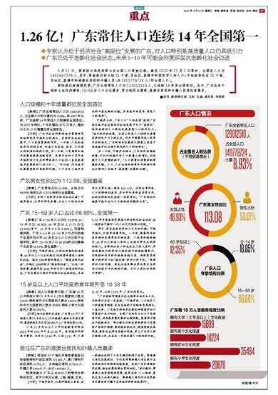 ●专家认为处于经济社会“高段位”发展的广东,对人口特别是高质量人口仍具吸引力 ●广东已处于老龄化社会状态,未来5-10年可能会向更深层次老龄化社会迈进 5月11日,国家统计局发布第七