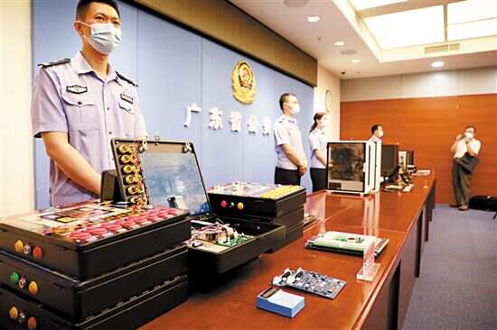 ■5月13日,广东省公安厅指挥中心召开“八大专项行动”严厉打击涉赌违法犯罪新闻发布会。警方展示缴获的涉赌作案工具。 新快报记者 孙毅/摄 |