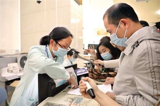 ■2021年1月17日下午4时,在广州市妇女儿童医疗中心一楼出院处,广州市一名患儿家长使用“穗岁康”办理出院结账。新快报记者 林里/摄 |