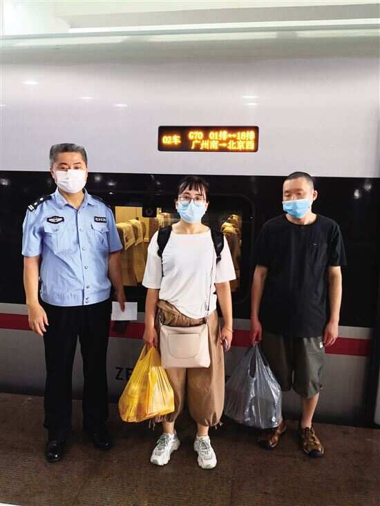 ■民警护送聋哑人士郭某及其妹妹登上回家的高铁。在广州越秀警方的帮助下,两兄妹在失散10年后终于团聚。 通讯员供图 |