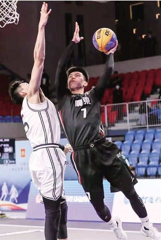 ■刘康能(右)在三人男篮成年组的比赛中进攻。 |
