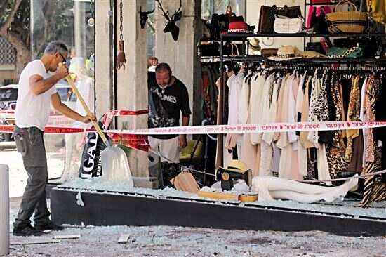 ■5月15日,以色列人在中部城市拉马特甘街头处理被巴勒斯坦发射的火箭弹损毁的商铺。新华社发 |